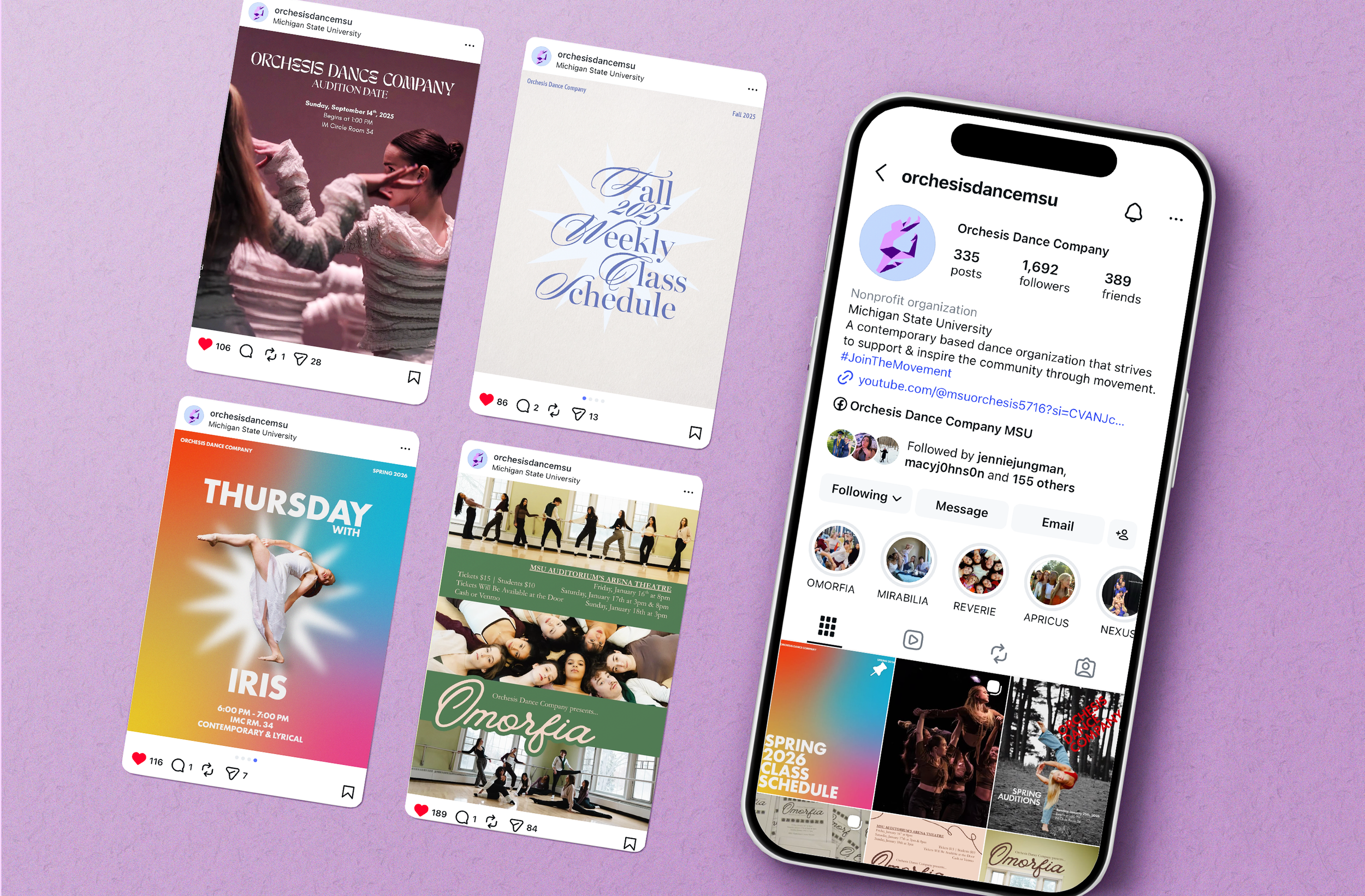 As Director of Marketing for Orchesis Dance Company, I manage and strategically lead the company’s Instagram presence, overseeing content planning, visual direction, copywriting, and engagement. Check out the full page @orchesisdancemsu.